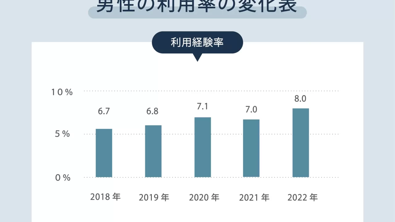 女性が 2018 年以降、10%前後 の利用率で頭打ちになっているのに対して、男性は 2019 年(4.0%)以降、利用率が上昇する傾向がみられる。